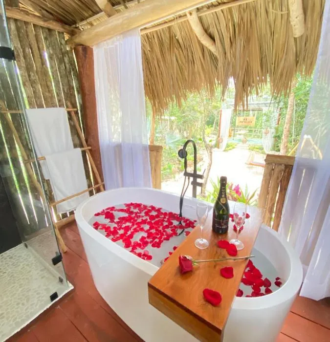 Dit hotel in Puerto Morelos beschikt over kamers met een patio en een balkon, evenals een stenen open haard voor uw gemak. Ze zijn voorzien van een bubbelbad, een apart toilet en een douche, evenals een haardroger en slippers. Je kunt van uitzicht op het zwembad genieten.